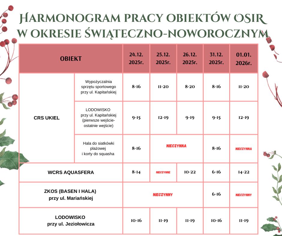 Harmonogram pracy obiektów OSiR w Olsztynie na okres świąteczny